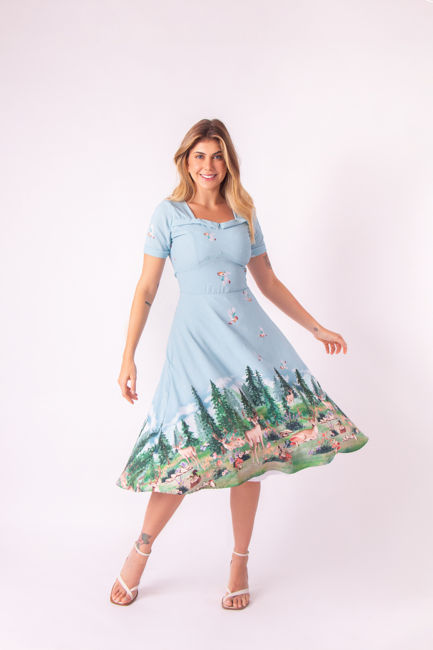 Nosso vestido Hyde Park trás duas versões dessa maravilhosa estampa, no vestido dia podemos ver um lindo céu azul com pássaros e no parque podemos ver duas espécies de animais encontrados na Inglaterra o esquilo vermelho e o cervo, já na versão noite temos um azul marinho lindo.