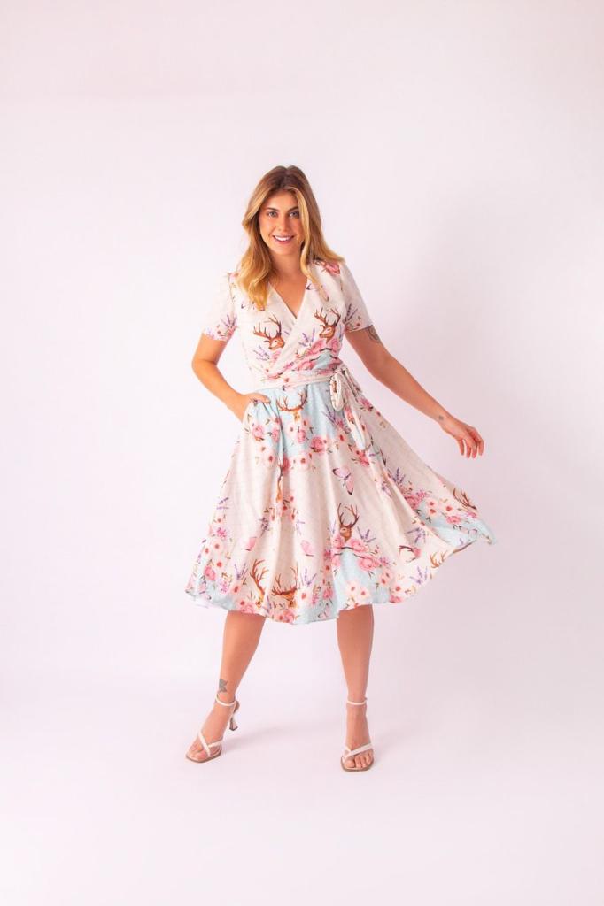 Nosso maravilhoso vestido Ada em Flor trás nossa estampa exclusiva com nosso animal mascote o cervo, nosso maravilhoso cervo vem banhado de flores e tom de azul céu magnífico é encantador, romântico e autêntico é tudo que você pode querer em um vestido!
